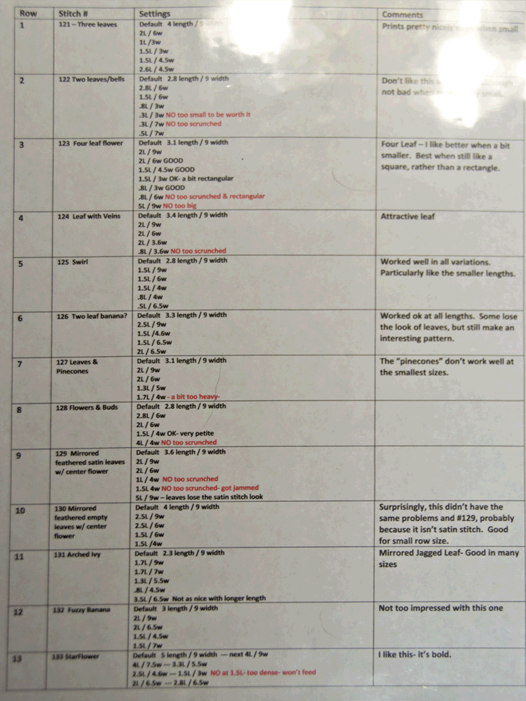 A page from my “Stitch Bible” for my Bernina 730 showing each row with