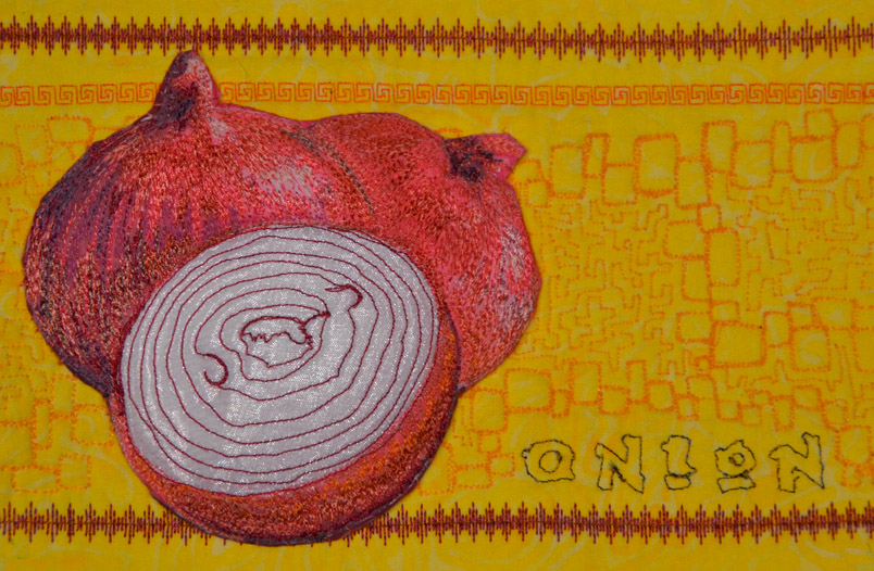 After the corn itself was complete, I thread-painted the husk. I’m not completely sure about my process here or whether I need to do more (or even take away some of what I did. After the thread painting, I laid some of the organza which I had painted on top and stitched it down. I didn’t stitch it entirely over the husk areas, as I wanted some of the pieces to be able to fold back and move in a breeze, like a real husk would do. After sewing it down, I cut around the edge of my sewing.