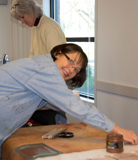 CQA President Marylee Drake (foreground) doing Thermofax screen printing with Colleen Wise (background) |