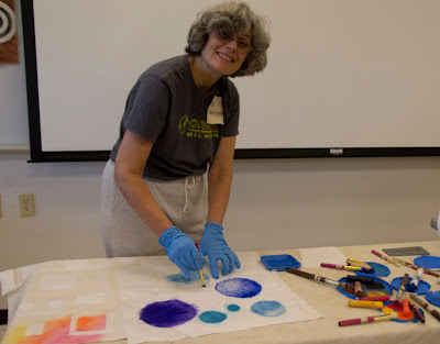 Peg Swartzman teaching how to use Oil Paintsticks with Freezer paper resists and stenciling brushes for an elegant gradient effect |