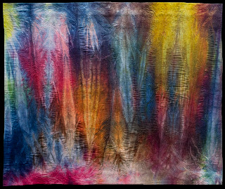 Also in the “Journeys” show is my “Caverna Magica” whole-cloth quilt. When I completed the dyeing of this fabric, it reminded me of seeing the Caves of Nerja, in Andalusia, Spain. Filled with impressive stalactites and stalagmites, sections of the caves are open to visitors and are lit up with many beautiful colored lights. I hand-dyed this piece of fabric and then densely freehand machine quilted it with cotton, rayon, and silk thread.