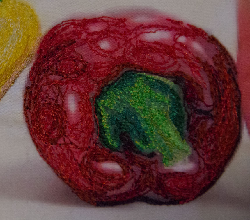 With the orange pepper, I again started with the stem and the darker shading. As you can see, most of the stitching goes in the direction of the shape of the vegetable. With the underlayment, I will go across the grain, but most of this stitching will be beneath other layers of color, so it won’t show the cross-grain stitches.